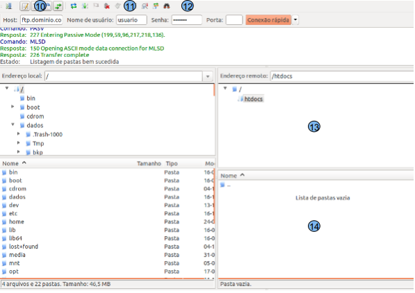 Após a redefinição da senha, o acesso aos arquivos pode ser realizada através do Cliente FTP que o cliente julgar mais adequado. Um software cliente FTP bastante utilizado é o FileZilla que pode ser encontrado no endereço:https://filezilla-project.org/download.php Após instalação, as informações definidas nas configurações de “Acesso a hospedagem web” podem ser utilizadas para login: (10) Host: Endereço de acesso FTP: ftp.dominio.com.br (11) Nome de usuário: Nome de usuário definido anteriormente (2) (12) Senha: Definida anteriormente (3) (13) Lista de diretórios remoto: Nesse local são exibidos os diretórios remotos (14) Lista de arquivos: Nesse local são exibidos os arquivos do diretório selecionado