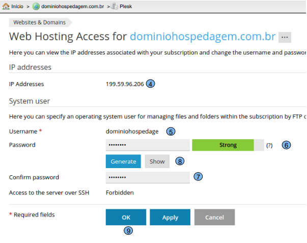 Na próxima tela defina a nova senha para o usuário FTP: (4) IP Addresses: Endereço IP de acesso, sempre utilize ftp.dominio.com.br (5) Nome do usuário: Criado automaticamente (6) Senha: Defina uma nova senha de acesso para o acesso FTP (7) Confirme a senha: Deve ser digita a mesma senha do campo anterior (8) Generate: Utilize a opção caso deseje a geração de uma senha aleatória (9) OK: Clique no botão “OK” para realizar a alteração da senha