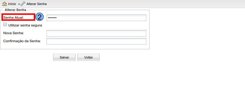 Nesta tela, para alterar a senha será preciso inserir a senha atual, basta digitá-la no campo “Senha Atual” (2).