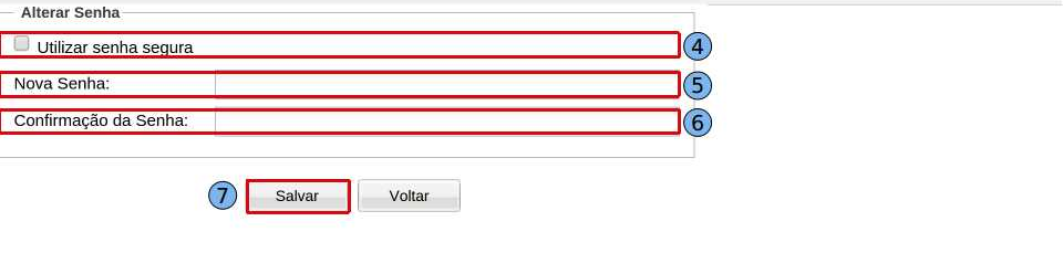 A opção “Utilizar a senha segura” (4) é utilizada no caso da caixa postal ser capturada para realizar o envio de e-mail SPAM. “Senha” (5), escreva a senha de preferência (Letras maiúsculas (A-Z); Letras minúsculas (a-z); Números (0-9); Caracteres especiais por exemplo, !, $, #, %). Campo “Confirmação de senha” (6): confirma a senha informada no campo “Senha” (5) e clique em “Salvar” (7).