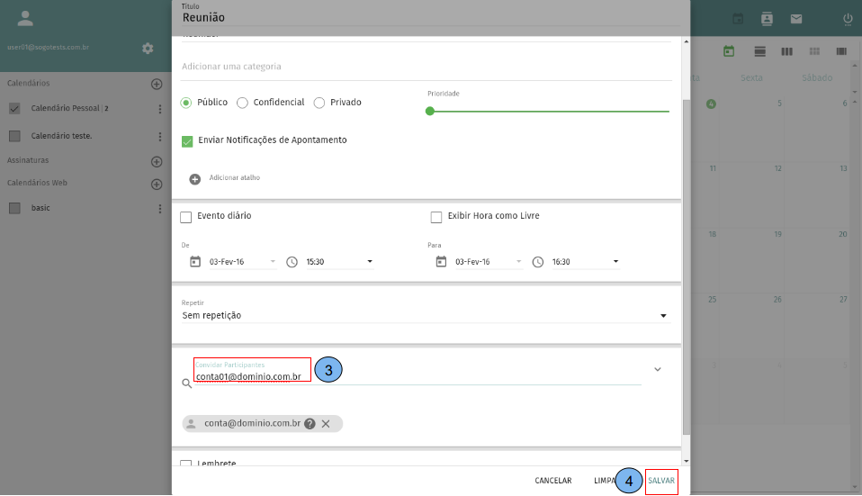 Em “Convidar Participantes”(3) digite o e-mail do usuário a ser convidado e em seguida aperte o botão “Enter” do seu teclado para cadastrar o convidado. Obs: Se estiver utilizando o Webmail através de um dispositivo móvel clique em pesquisar para cadastrar o convidado. Para finalizar clique em “Salvar”(4).