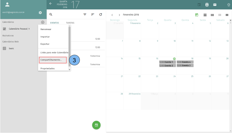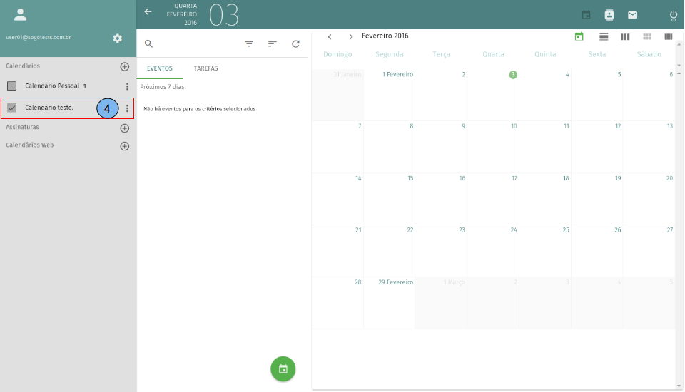 Na conta para onde o calendário foi compartilhado (8), veja que o calendário já aparece para o usuário (9), ao selecionar o calendário em questão é possível acessar os eventos e tarefas do mesmo (10).