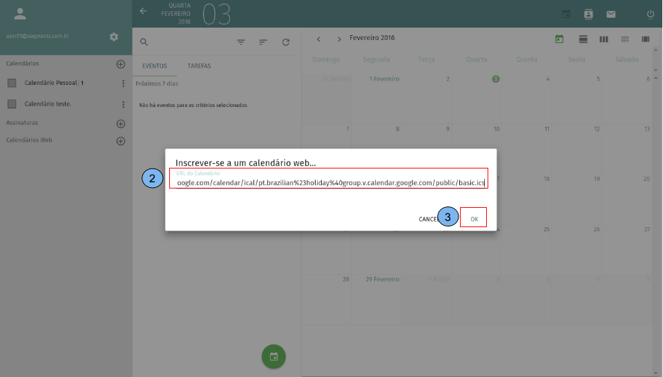 (2)Insira a URL do calendário da Web. (3)Para concluir clique em “OK”.