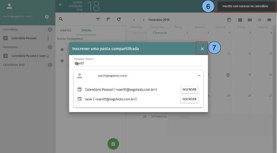 (6) Após selecionar o e-mail marque a opção “Usuário inscrito”. (7) Clique em salvar para o calendário ser compartilhado.
