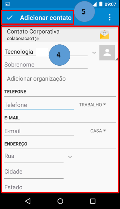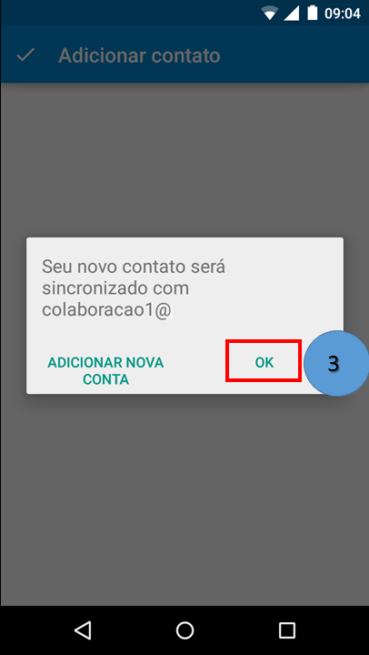 Selecione a conta colaborativa onde o contato será criado e clique em “OK” (3), em seguida preencha os dados referente ao contato (4) e depois clique em “Adicionar contato” (5).