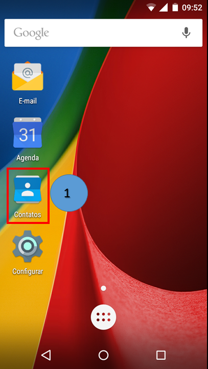 As telas abaixo mostram como adicionar contatos em dispositivos Android. Abra o aplicativo de contatos do seu dispositivo (1).