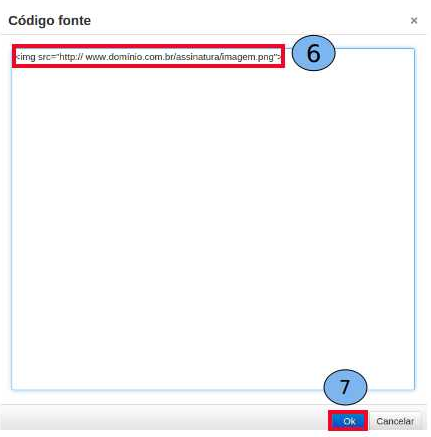 Insira o código abaixo que irá inserir a imagem na assinatura: Substitua o link pelo da imagem da assinatura no servidor (6), que foi testado anteriormente e clique em “Ok” (7).