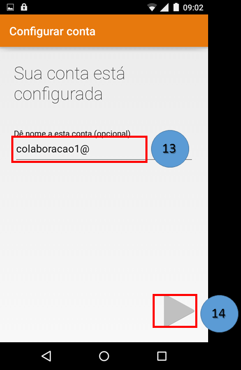 Na próxima tela aparecerá o nome da sua conta (13), para finalizar a configuração da clique em “PRÓXIMO”(14).
