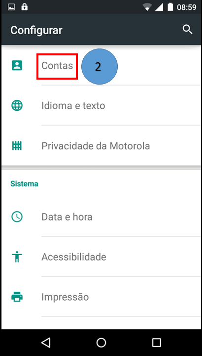 As telas abaixo mostram como realizar a configuração da conta em dispositivos Android. Abra Configurar “desenho de uma engrenagem”(1)
