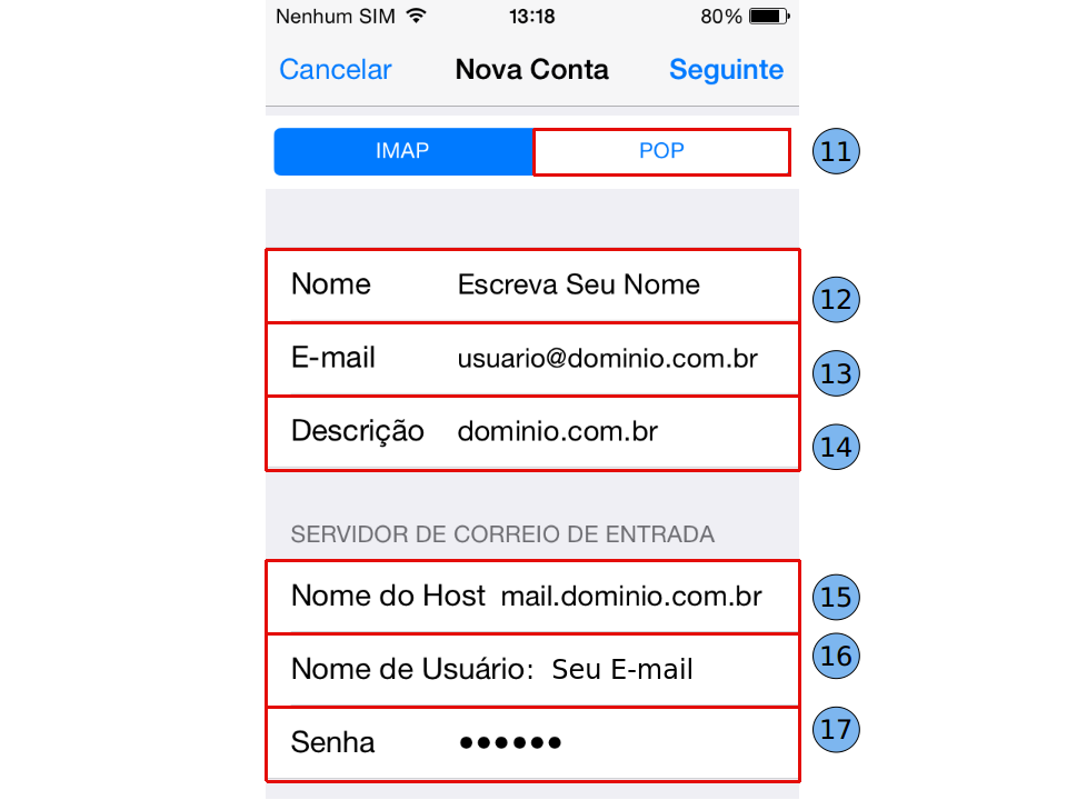 Agora preencha as informações de recebimento e de envio: Nome (12): digite seu nome Endereço (13): digite o endereço completo do seu e-mail. Descrição (14): digite seu e-mail ou a descrição que desejar. "Servidor de Correio de Entrada": Nome do Host (15): mail. dominio.com.br Nome de Usuário (16): digite seu e-mail. Senha (17): digite sua senha.