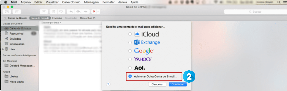 Na janela que surgir, selecione Adicionar Outra Conta de Email…   2     e clique em Continuar