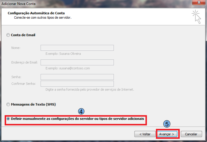 Clique na opção Definir manualmente as configurações do servidor ou tipos de servidor adicionais (4) e em seguida clique em Avançar (5).