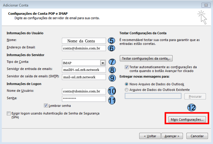 Nome (5), digite o nome para exibição Endereço de Email (6), digite seu endereço de e-mail Tipo de Conta (7), escolha a opção IMAP Servidor de entrada de e-mails (8), digite o endereço de acordo com seu domínio, exemplo: mail01-ssl.m9.network Servidor de saída de e-mails (9), digite o endereço de acordo com seu domínio, exemplo: mail-ssl.m9.network Nome de usuário (10), digite seu endereço de e-mail Senha (11), digite a senha do seu e-mail Após preencher os campos acima, clique na opção Mais configurações (12)
